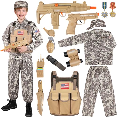 - All-In-One Deluxe Kids Military Army Costume– Your little soldier will be mission-ready with this 5 piece military costume set, featuring army vest, jacket, pants, hat, and belt—plus 9 piece army toys like a grenade, binoculars, walkie-talkie, dagger, and whistle! The deluxe Halloween army costume for boys set will bring more realistic army experience to kids and fully immerse themselves in the world of heroes on Halloween and other dress-up activities! Perfect boys Halloween costumes 8-10.