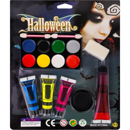 8 Colors Face & Body Paint Palette Kit + 1 Black Cream Face Body Paint + Washable Fake Blood + 3 UV Light Colors, Non-Toxic Hypoallergenic for Halloween SFX